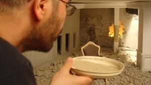 Iraqi artist Waffa Bilal presents The Ashes Series, a cycle of photographs featuring miniatures model of his own construction which trace photographs uploaded online, documenting the ruins in Baghdad in the wake of the war in Iraq. At the heart of Bilal’s photographs, amidst the ruins of Saddam Hussein’s house, stands a chair the likes of which may be found in European palaces. 21 grams of human ashes mixed with organic ashes were scattered on the model. The photographs, documenting the construction of the recreated model, explore the impact of the destruction on domestic spaces expropriated from the private domain following their exposure by the media, pointing at the violent act that took place in them. Bilal examines the alienation generated by the language of art in general, and the language of photography in particular, indicating the indifference of those viewers to the horrifying photographs due to their vast quantity. The act of reconstruction brings the viewer closer to the intimacy of these rooms, while exposing the horror that has taken place in them. The spaces form a symbolic reminder of the repression involved in political conflicts and cultural dichotomies, such as George Bush’s speech which divided the world into those who belonged to the ”axis of evil” and those who did not. According to Bilal, an Iraqi refugee living in the United States, the photographs represent his attempt to find logic in a destruction resulting from cultural clashes, and to preserve the beauty inherent in the moment after the storm, once the violent act has ended and the ashes settle.