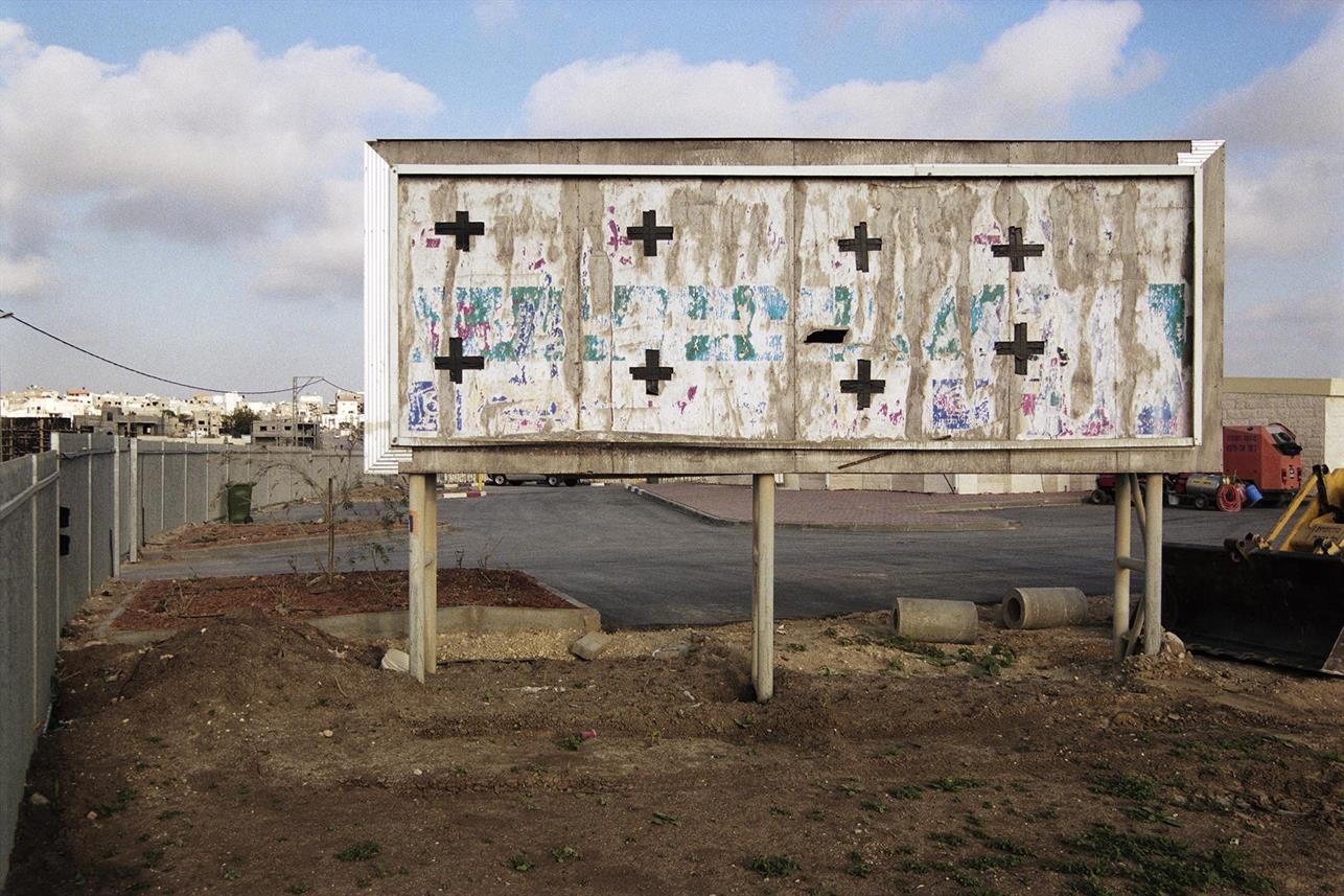 באחת העבודות המוקדמות בפרויקט צילם עמיר שלט פרסום הניצב במתחם המועצה. על המשטח הגדול נראים רק סימני + שחורים אקראיים – כפי הנראה סימני הדבקה ישנה – אשר מנמרים את המשטח הלבן-תכול, המהדהד את השמים שמעליו. סימני חיבור אירוניים, שאינם מצטברים לדבר. פרסומת ללא-כלום, ובכל זאת יצא עמיר לגלות מה יש בג’סר אל-זרקא מאחורי הסימן הריק, מעבר ללוח הריק.